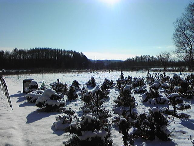 右:畑の一部。奥の方にハスカップの苗木がわんさかあります。枝の中に鳥の巣とかもあったり。